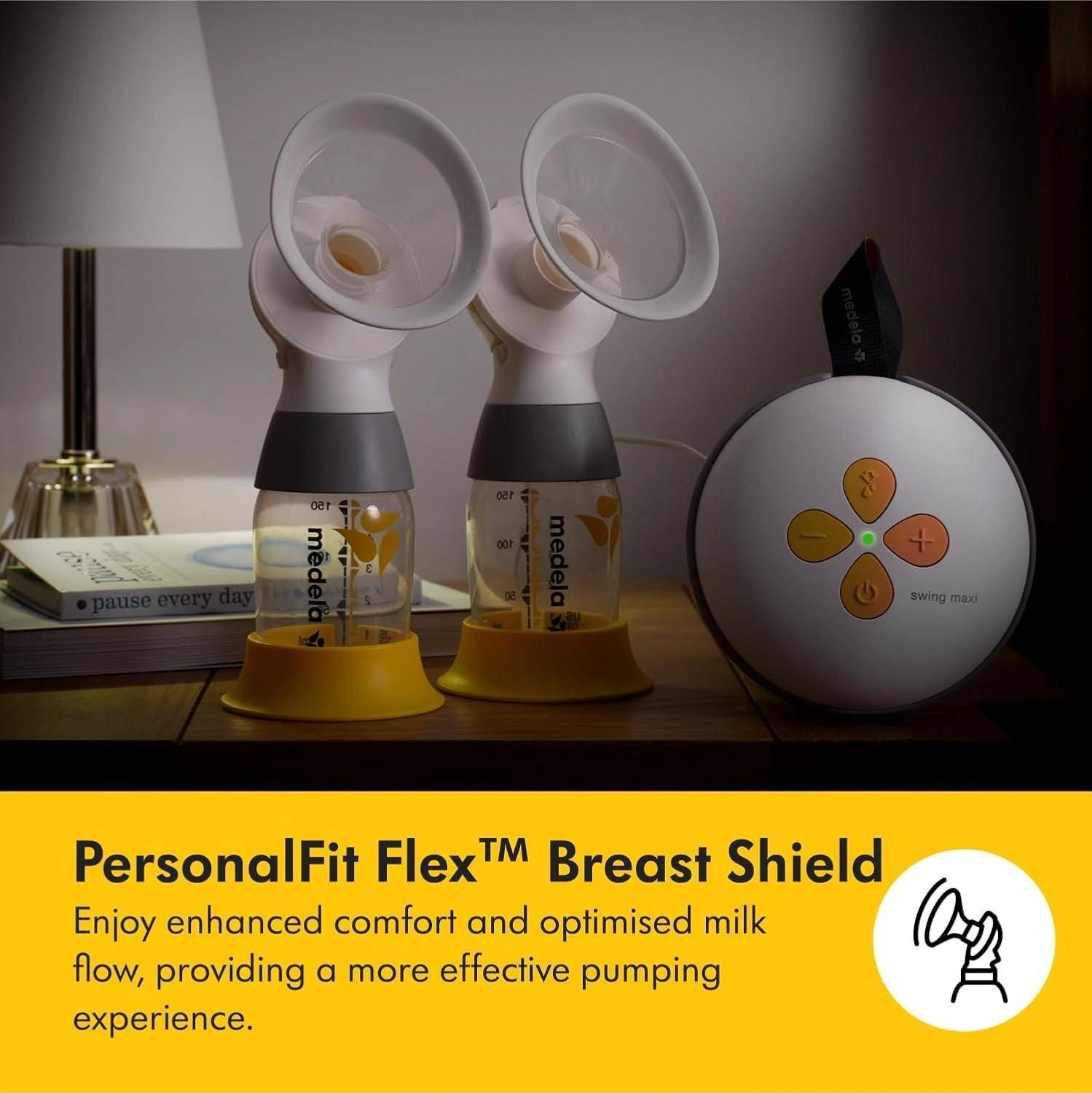 Pompa de sân electrică dublă Medela Swing Maxi poate fi folosită atât concomitent la ambii sâni, cât și la un singur sân – cu putere dublă. Opțiune extrem de utilă în cazul canalelor adânci sau blocate. Produsul oferit conține 4 cupe colectoare pentru sân PersonalFit Flex (2 x 21 mm, 2 x 24 mm).